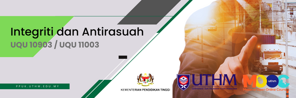 Kursus ini merangkumi konsep asas rasuah termasuk nilai integriti, antirasuah, bentuk perlakuan rasuah, salah guna kuasa dalam aktiviti seharian dan organisasi serta kaedah pencegahan rasuah. Kes berkaitan rasuah juga dibincangkan. Kaedah pengajaran dan pembelajaran dilaksanakan dalam bentuk ‘pembelajaran berdasarkan pengalaman’ melalui aktiviti individu dan kumpulan. Pada akhir kursus ini, pelajar dapat memahami amalan integriti, konsep rasuah, antirasuah dan salah guna kuasa serta pencegahan rasuah dalam masyarakat dan organisasi.